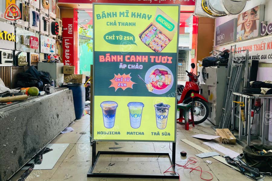 Hộp đèn bạt có chân là một dạng biển quảng cáo sử dụng khung sắt hoặc inox làm chân đứng kết hợp với mặt bạt in Hiflex căng sáng, bên trong lắp hệ thống đèn LED chiếu sáng. Thiết kế này cho phép hộp đèn đặt độc lập trên mặt đất mà không cần gắn tường, thường được bố trí trước cửa hàng, quán ăn, tiệm tóc hoặc các khu vực có lưu lượng người qua lại cao. Nhờ tính linh hoạt, dễ thay đổi nội dung và khả năng hiển thị tốt cả ngày lẫn đêm, hộp đèn bạt có chân là giải pháp truyền thông hiệu quả với chi phí hợp lý.