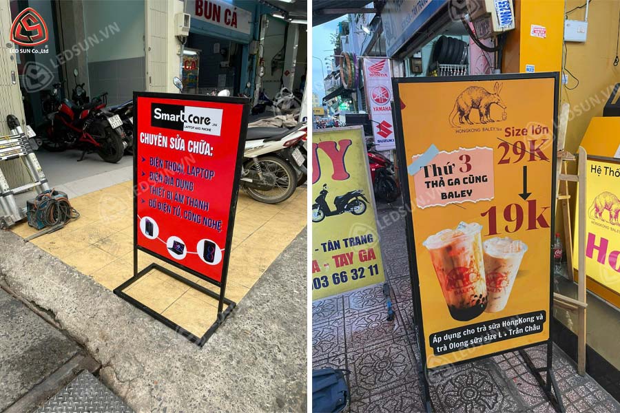 Standee chân sắt ngoài trời là loại bảng quảng cáo có khung chân làm từ sắt mạ kẽm hoặc sơn tĩnh điện, bền chắc và chịu được thời tiết khắc nghiệt. Bề mặt hiển thị thường làm từ bạt hiflex, mica, hoặc alu, đảm bảo chống nước và bền màu. Với thiết kế linh hoạt, dễ di chuyển và chi phí hợp lý, standee chân sắt thường được dùng để quảng cáo sự kiện, giới thiệu sản phẩm, hoặc cung cấp thông tin tại các không gian công cộng. Đây là giải pháp hiệu quả, tiết kiệm cho các chiến dịch quảng bá ngoài trời.